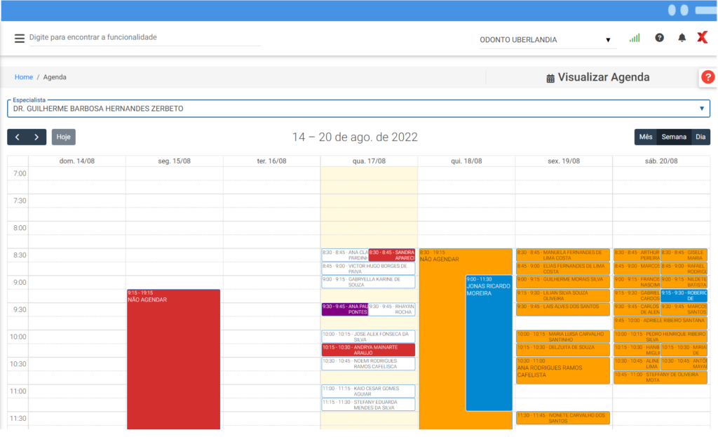 Organização por especialista, status e legenda. Visualização diária, semanal ou mensal.