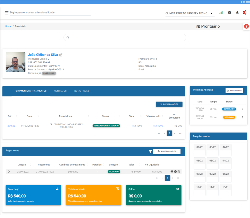Prontuário eletrônico organizado com foto, titulares e dependentes, agendas, controle de frequência, etc.